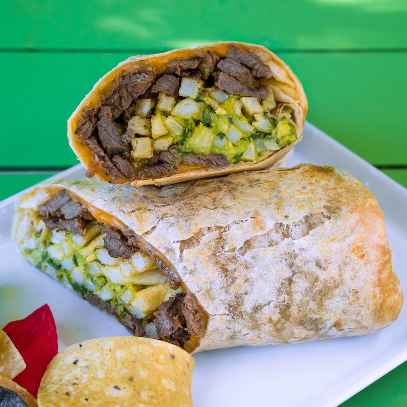 Served on a flour tortilla with sour cream, guacamole, and salsa fresca